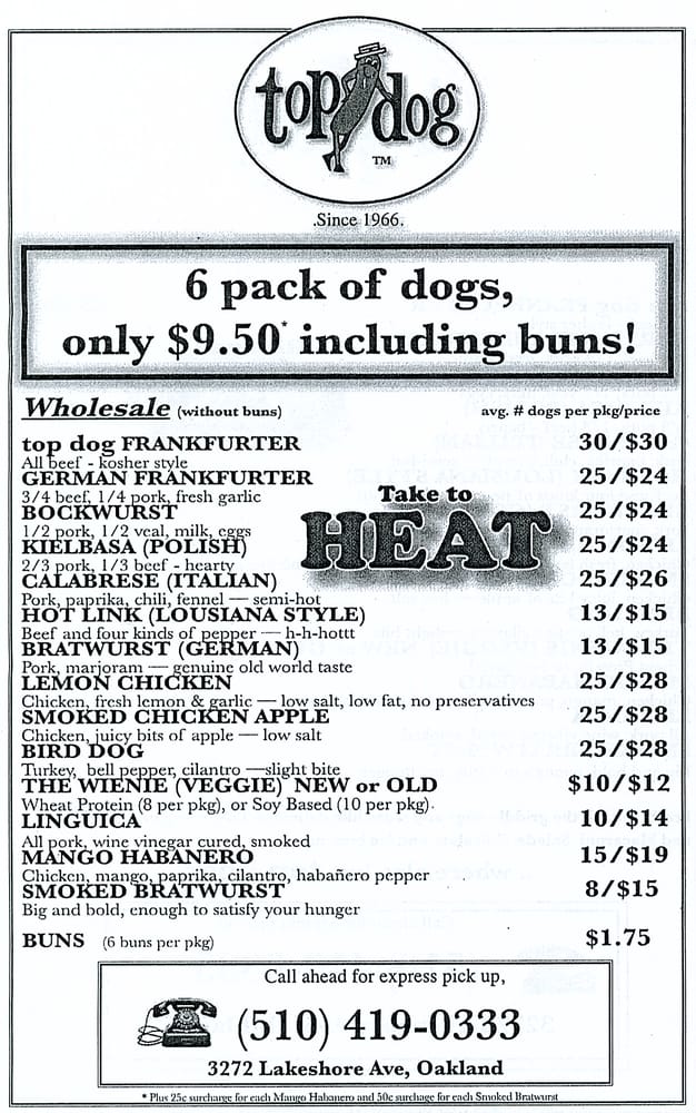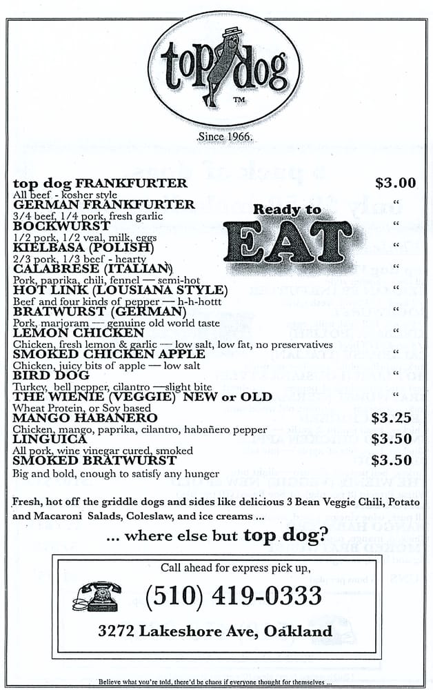 Top Dog, located in Oakland, CA, is a hot dog lover's paradise offering a variety of mouth-watering options. From the classic Top Dog Frankfurter to unique creations like the Mango Dog and Lemon Chicken Dog, there is something for everyone. Sides like chips, potato salad, and chili complement the flavorful dogs perfectly. Customers rave about the delicious dogs and friendly service, with one reviewer even calling it a gourmet experience deserving of a 5-star rating. The affordable prices and convenient location make Top Dog a must-visit for hot dog enthusiasts. So, whether you're craving a traditional bratwurst or looking to try something new like the Calabrese Italian style, Top Dog is the place to go for a satisfying and budget-friendly meal. With options for takeout, delivery, and catering, Top Dog caters to all your hot dog needs.